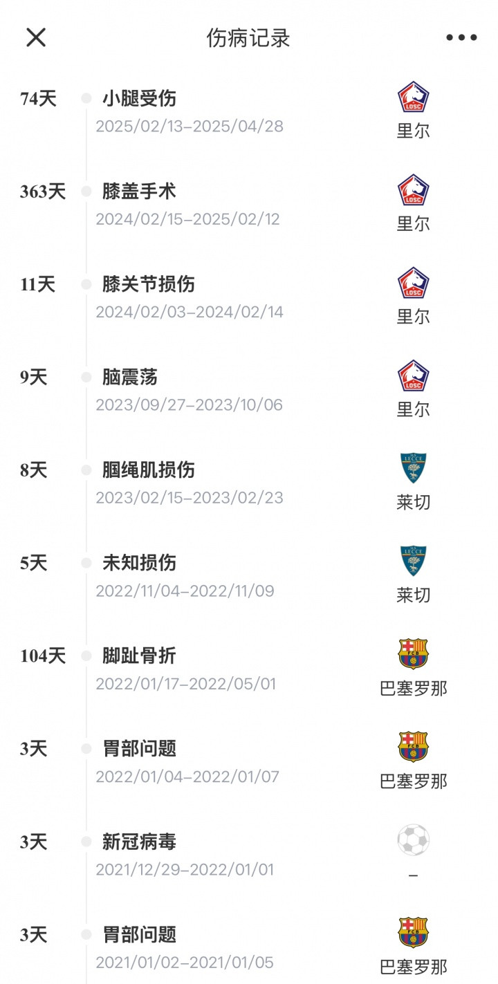 乌姆蒂蒂现年31岁,上一次他出场还要追溯到差不多19个月之前,2024年1月22日里尔对阵法兰西竞技的法国杯。乌姆蒂蒂近年来后伤势不断,2024年2月接受膝盖手术,今年2月恢复训练后未代表里尔再出场。